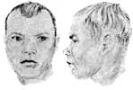 tiene rasgos faciales característicos: cara rómbica. Ojos