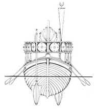 A vessel of considerably greater size than this, but of the same class --impelled, that is, by one bank of oars only--is indicated by certain coins, which have been regarded by some critics as Phoenician, by others as belonging to Cilicia.5 These have a low bow, but an elevated stern; the prow exhibits a beak, while the stern shows signs of a steering apparatus; the number of the oars on each side is fifteen or twenty. The Greeks called these vessels triaconters or penteconters. They are represented without any mast on the coins, and thus seem to have been merely row-boats of a superior character.
